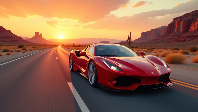 A stunning, ultra-luxurious sports car with a sleek, aerodynamic design and glossy metallic finish, parked on a breathtaking scenic road. The backdrop features a winding coastal highway with towering cliffs on one side and a vast ocean reflecting the golden hues of a mesmerizing sunset on the other. The sky is painted with shades of orange, pink, and purple, casting a warm glow over the scene. The car’s LED headlights are subtly illuminated, and its polished chrome details shimmer in the fading sunlight. The atmosphere is peaceful yet powerful, evoking a sense of elegance, wealth, and adventure.